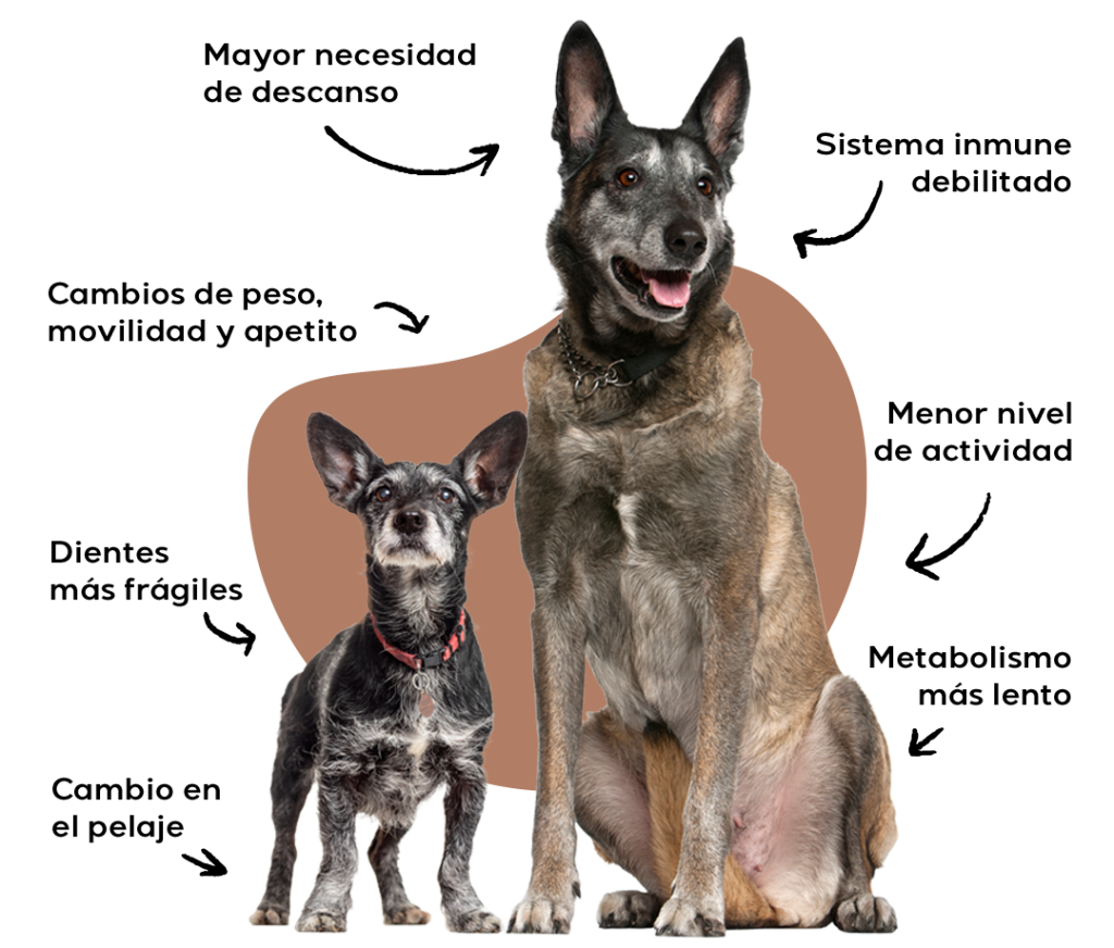 Tu perro entra en su etapa senior después de los 7 años de edad, en la que su metabolismo se desacelera y con ello empiezan a manifestarse algunos signos de envejecimiento.